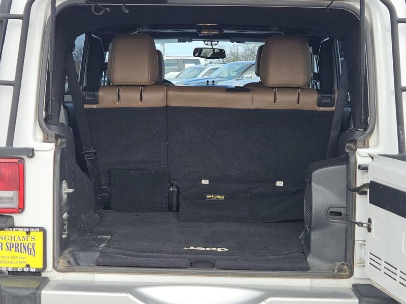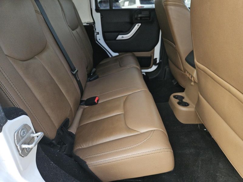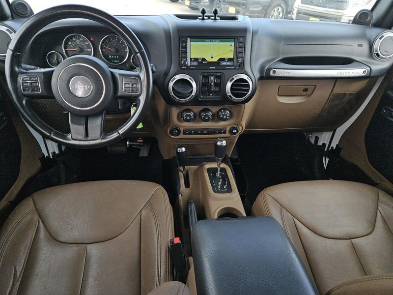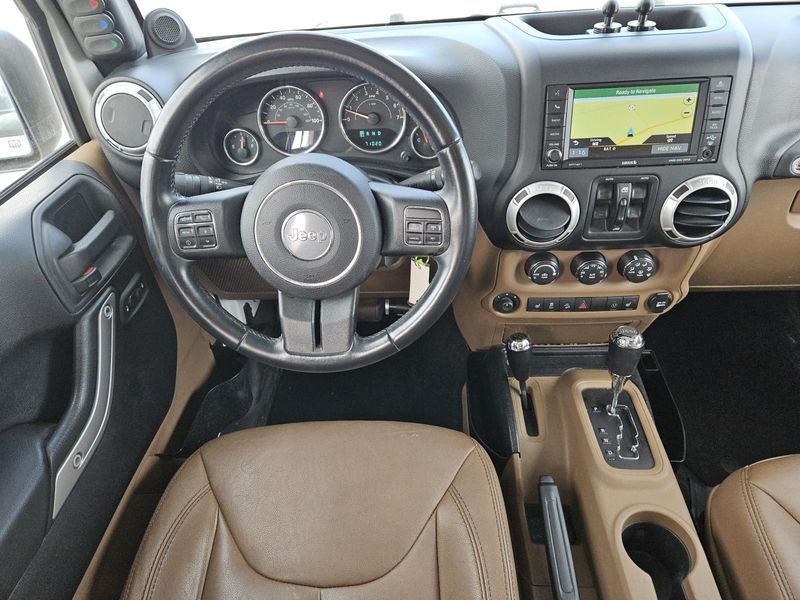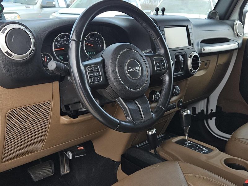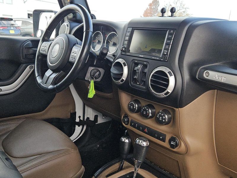 This Bright White Clearcoat 2014 Jeep Wrangler Unlimited Sahara has 71,016 miles and has a beautiful Dark Saddle/Black interior color.