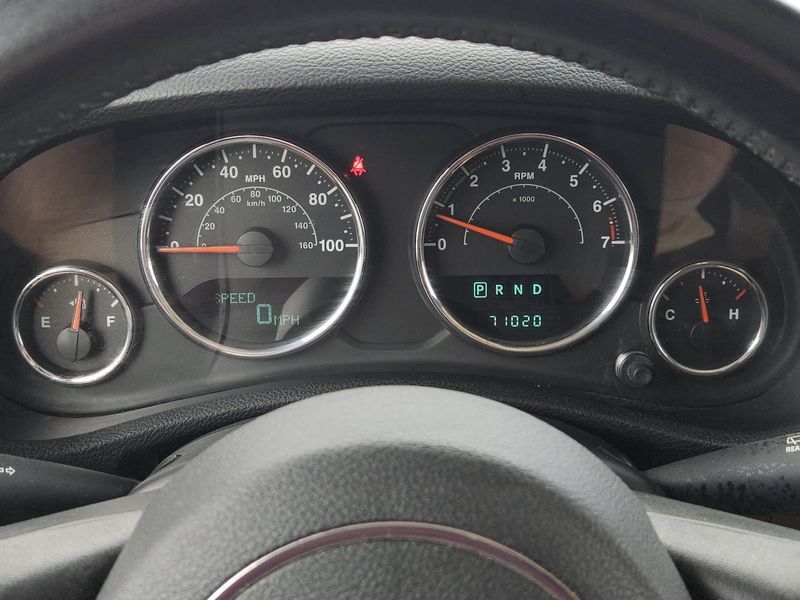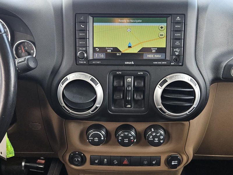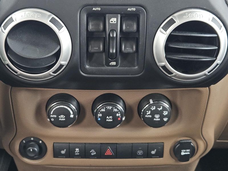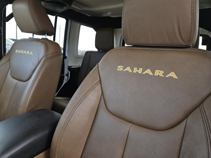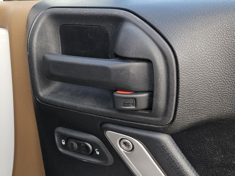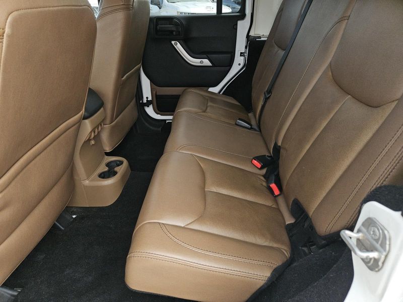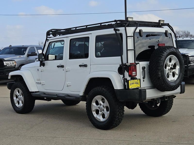 This Bright White Clearcoat 2014 Jeep Wrangler Unlimited Sahara has 71,016 miles and has a beautiful Dark Saddle/Black interior color.